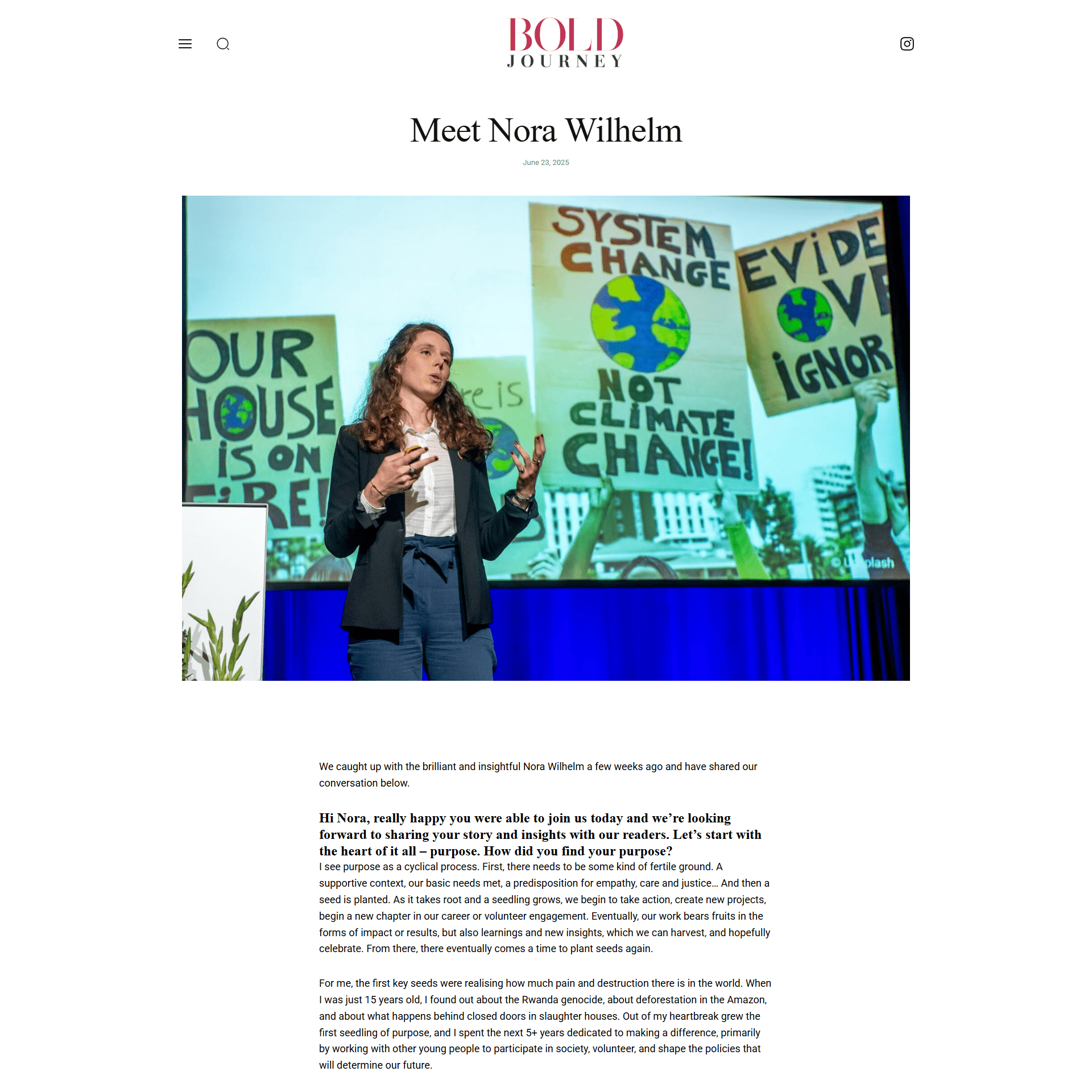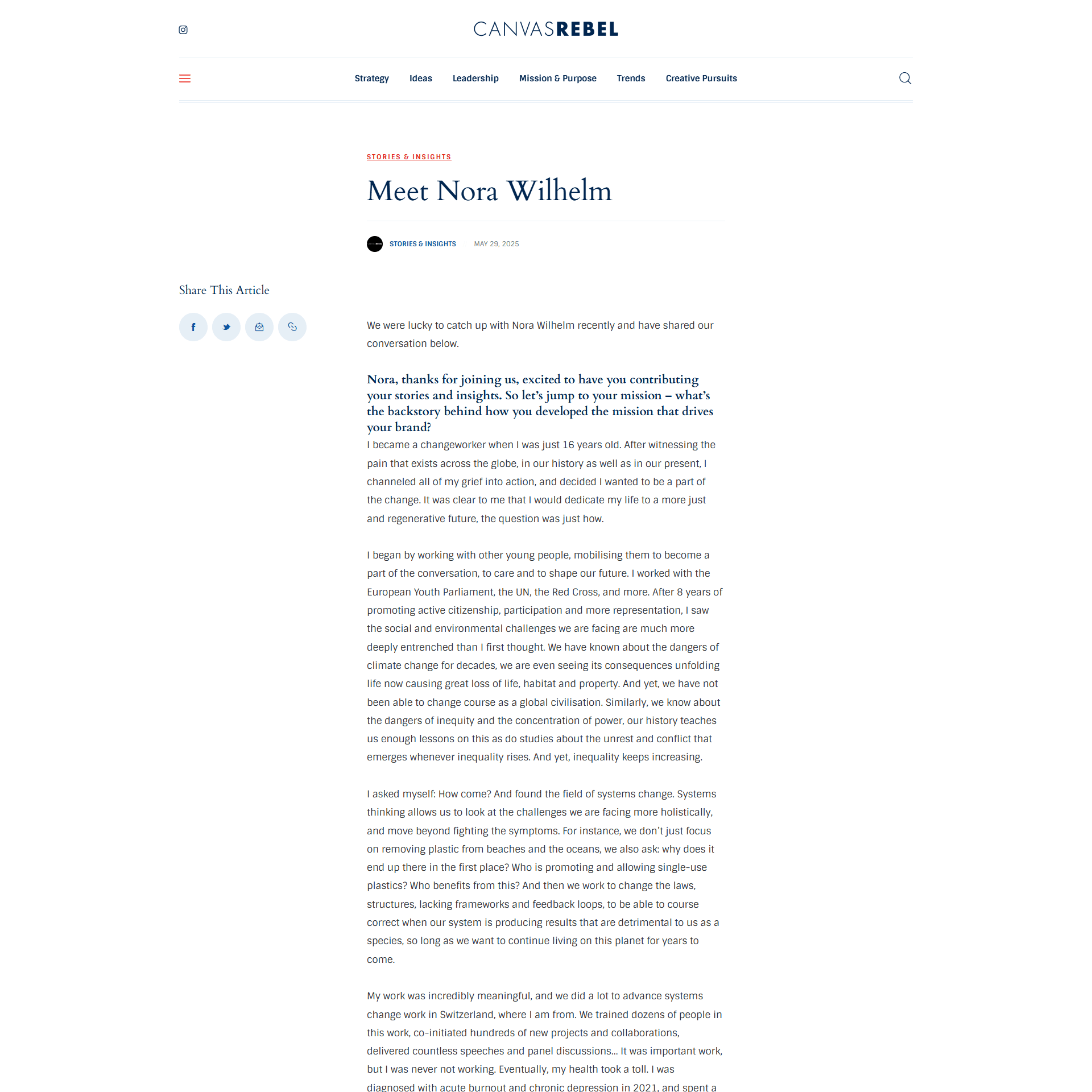Nora Wilhelm is a social innovator and systems entrepreneur dedicated to driving positive change for a regenerative and just future. Her journey as a changemaker began at the age of 15, when she became deeply aware of global challenges, particularly in youth engagement and sustainable development. This early commitment to active citizenship led her to work with international NGOs and, over time, to focus on systems change and social innovation.